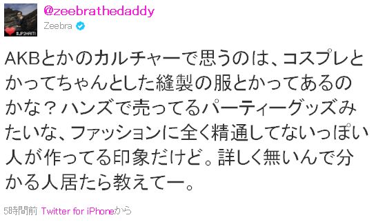 AKBとかのカルチャーで思うのは、コスプレとかってちゃんとした縫製の服とかってあるのかな?ハンズで売ってるパーティーグッズみたいな、ファッションに全く精通してないっぽい人が作ってる印象だけど。詳しく無いんで分かる人居たら教えてー。(ツイッ拓)http://twittaku.info/view.php?id=117169151432335360