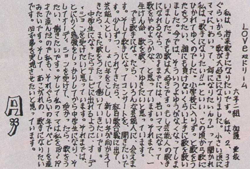 もし芸能人の歌手になれるなら、20才までには、若いママになって、歌をやめようかな、と思っています。