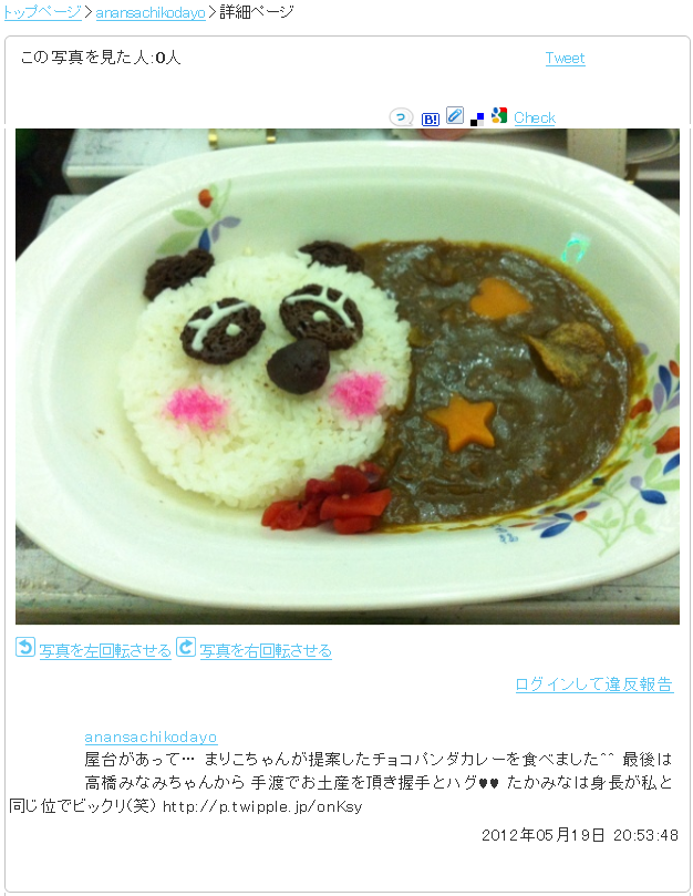 屋台があって… まりこちゃんが提案したチョコパンダカレーを食べました^^ 最後は高橋みなみちゃんから手渡でお土産を頂き握手とハグ たかみなは身長が私と同じ位でビックリ(笑) http://p.twipple.jp/8wkls http://p.twipple.jp/onKsy