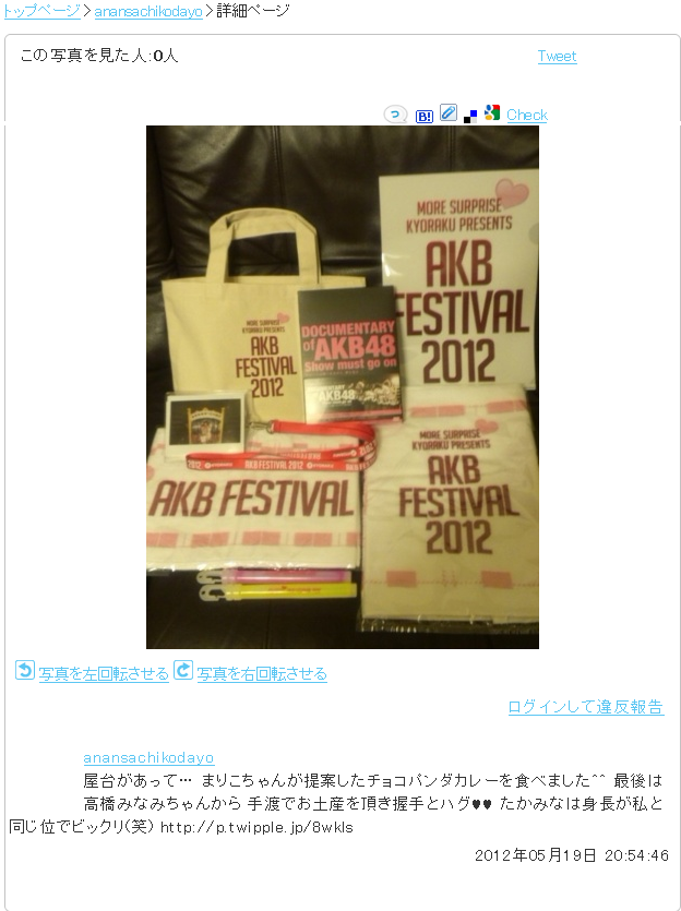 @mariko_dayo AKB FESTIVAL2012お疲れ様です!楽しい時間をありがとうございました(@ ̄ρ ̄@)まりこさまから手渡しでお土産貰えて嬉しかったです><!握手もしてくれてありがとうございました( ; ; )???