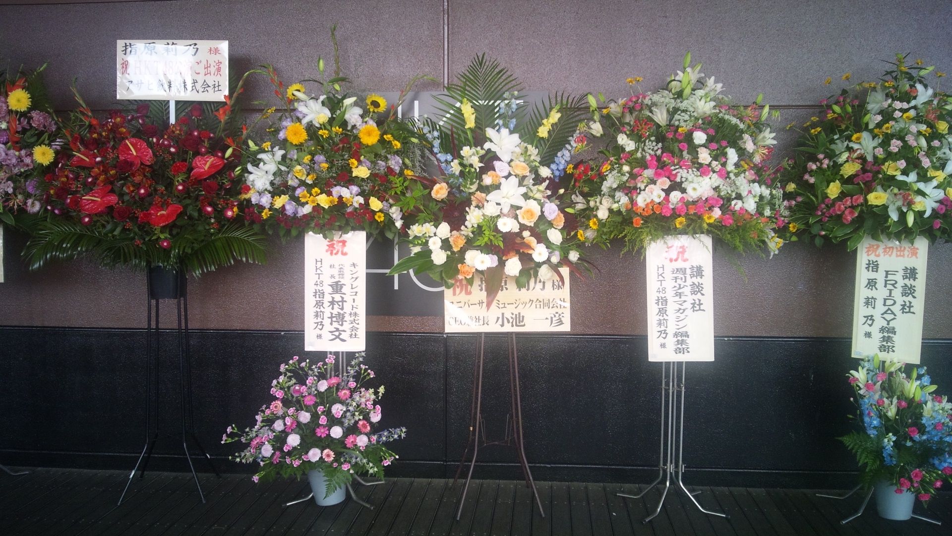 福岡ドームに野球観にきたら、今日はさしこがHKT48のデビュー初日らしく、花がいっぱい(^。^) 画像はHKT48劇場のまえで高田課長がテレビレポートしてるところ http://t.co/nwZztucq