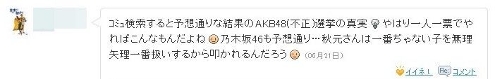 「AKB48(不正)選挙」、「秋元さんは一番ぢゃない子を無理矢理一番扱いするから叩かれるんだろう」などと揶揄。