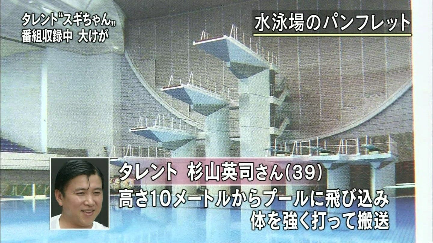 テレビ朝日や所属事務所のサンミュージックによると、スギちゃんは番組の企画として飛び込みに挑戦。同日午前1時ごろ、千葉県習志野市の千葉県国際総合水泳場で高さ10メートルの飛び込み台からプールに飛び込んだ際に、胸椎を骨折したという。すぐに病院に搬送されて入院。病院では「第十二胸椎粉砕骨折で全治3カ月」と診断された。意識はあるという。