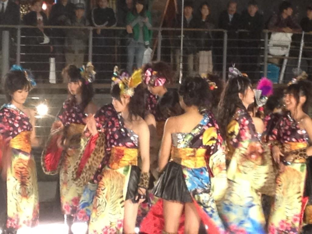 道頓堀なう。川の上で船が止まって何かやってる。微妙な色合いの着物を着た団体が踊ってるようだ。…NMB?