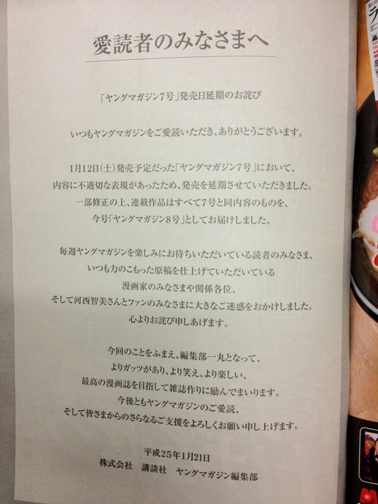 ヤングマガジン第7号、発売日の遅延のお詫びhttp://kc.kodansha.co.jp/magazine/index.php/02888 (魚拓)