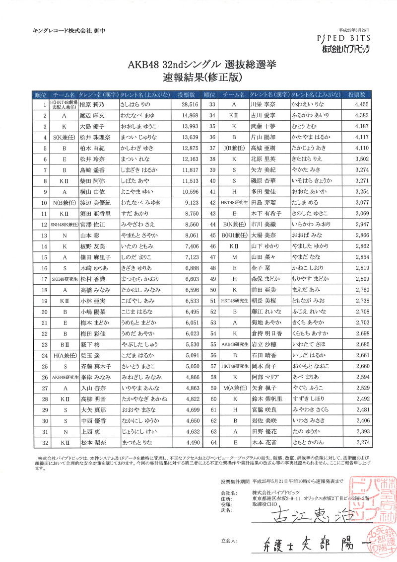 この件に関し、調査及び精査を行ったところ、速報集計時で545票、本日(5月26日)16時30分時点で1,129票の重複投票が認められました。http://ameblo.jp/hkt48/entry-11538686219.html