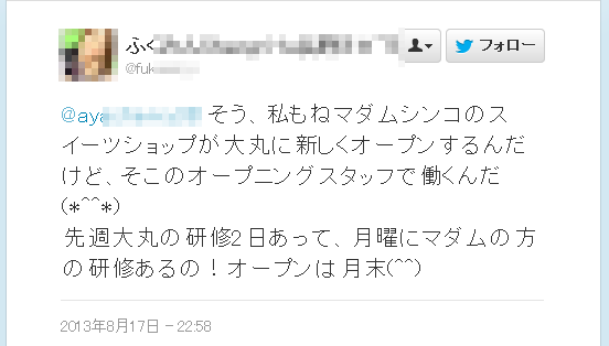 @****** そう、私もねマダムシンコのスイーツショップが大丸に新しくオープンするんだけど、そこのオープニングスタッフで働くんだ(*^^*) 先週大丸の研修2日あって、月曜にマダムの方の研修あるの!オープンは月末(^^)