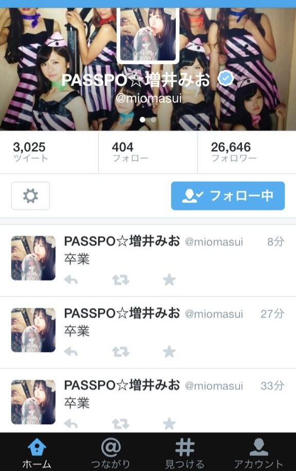 miomasui PASSPO☆増井みお 00:15:55Twitter for iPhone ※投稿後、数分でアカウントごと削除(恐らく事務所だと思われる)