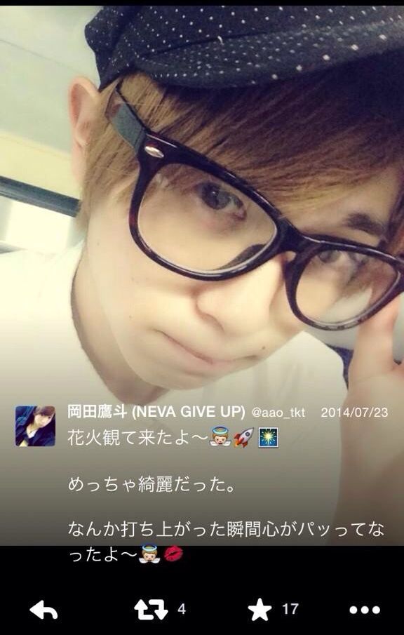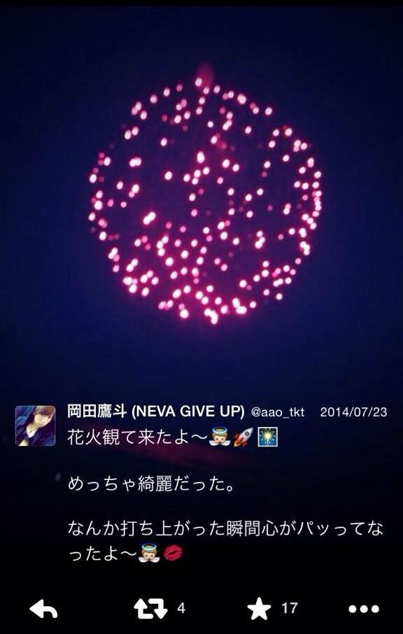 ※同日の岡田鷹斗のツイート「花火観て来たよー」