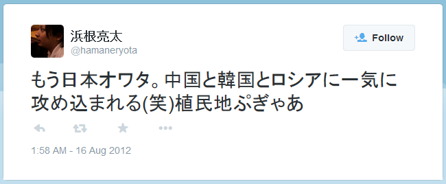 "もう日本オワタ。中国と韓国とロシアに一気に攻め込まれる(笑)植民地ぷぎゃあ"