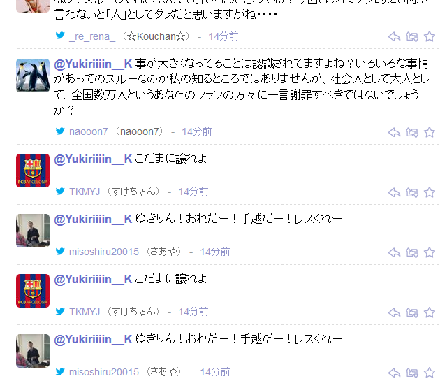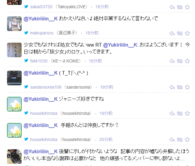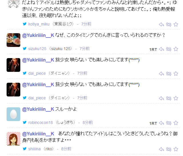 ゆきりん。今回のことに関して上の人から止められたりとか何かあると思うけど何かしらファンに向けてコメントを出すべきだと思うの。 別に罰を受けろとかではなくて何を信じればいいかわからないままなほど辛いことはないんだよ。