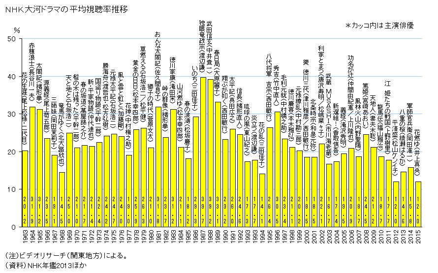 全50話の期間平均は12・0%。1994年度「花の乱」の14・1%を下回り、2012年度「平清盛」の12・0%と並ぶ大河ドラマ史上歴代ワーストタイとなった。