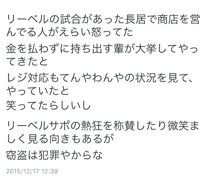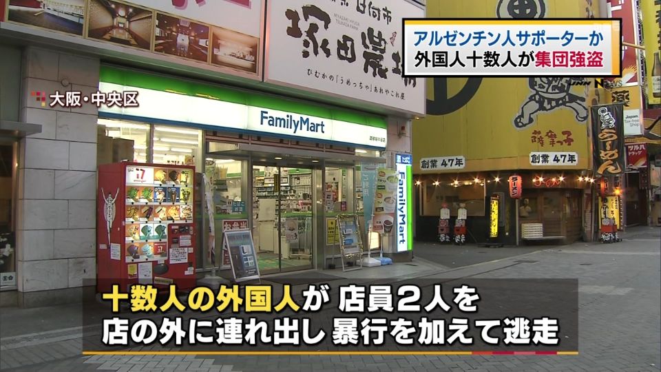 17日午前2時55分ごろ、大阪市中央区道頓堀1の「ファミリーマート道頓堀中座店」で、外国人風の男2人が缶ビール4本やサンドイッチなど数点を万引きし、アルバイトの男性店員(40)ら2人を押し倒して逃げた。さらに、店の前にいた外国人風の男ら10人前後が店員を取り囲んで殴る蹴るの暴行を加え、店員2人は頭や足などに軽傷を負った。大阪府警南署が強盗致傷容疑で逃げた男らの行方を追っている。http://mainichi.jp/articles/20151217/k00/00e/040/233000c