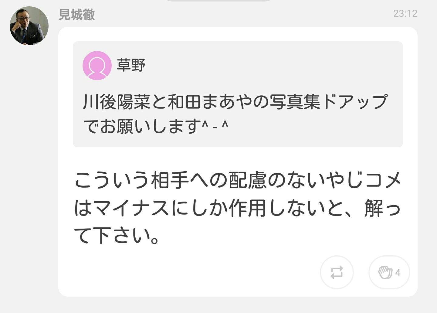 この人もたまに、見てみます、とかあの子いいね、とか言うからオタが猛プッシュかけるんだよなあ