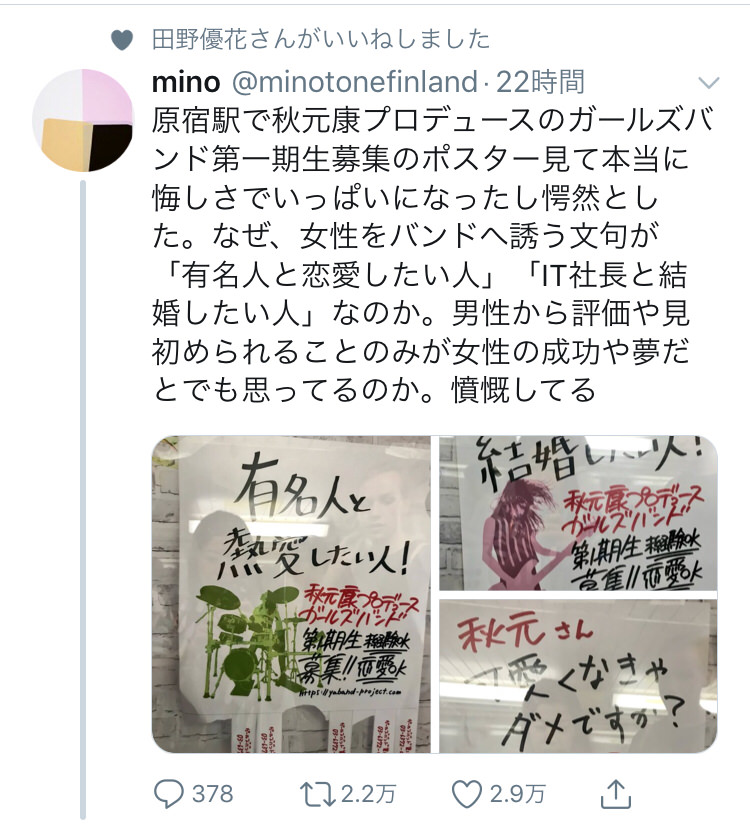 秋元康プロデュース、バンド募集ポスターが「女性蔑視」と炎上