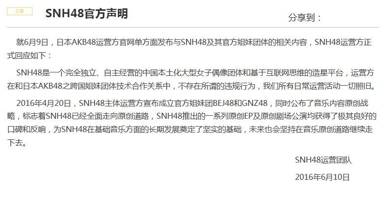 6月9日、日本のAKB48運営会社は公式サイトを通じて一方的にSNH48及び姉妹団体に関する内容を発表しました。それについてSNH48運営は正式に次の通りに応対します。