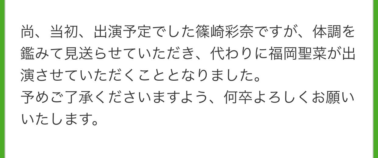 篠崎彩奈は、体調を鑑みて出演を見送らせていただき、