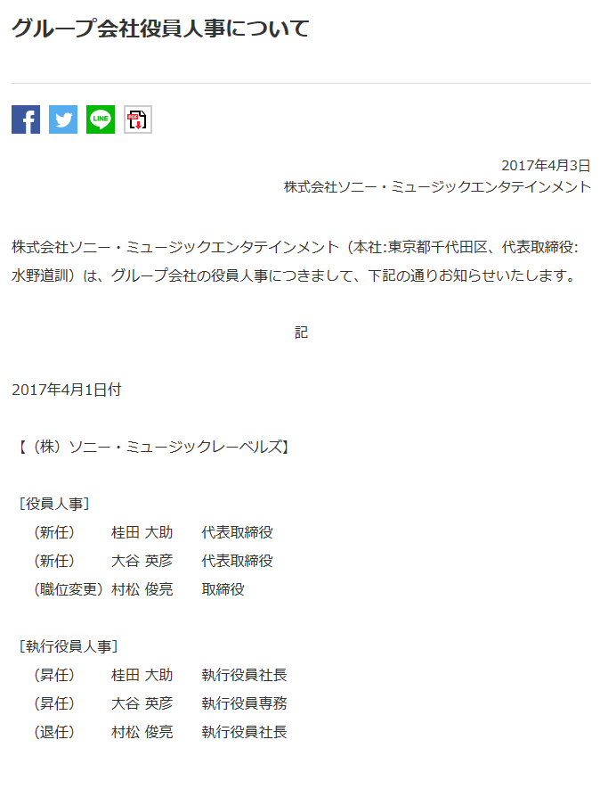 今月、(株)ソニー・ミュージックレーベルズ代表取締役・兼社長から取締役に降格
