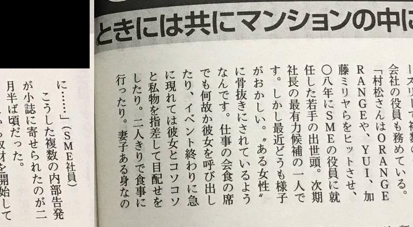 今週発売の週刊文春の記事で様々な憶測を呼んでいるようですが、ソニーミュージックの村松さんと私の間に隠さなければならない事実は何もありません。