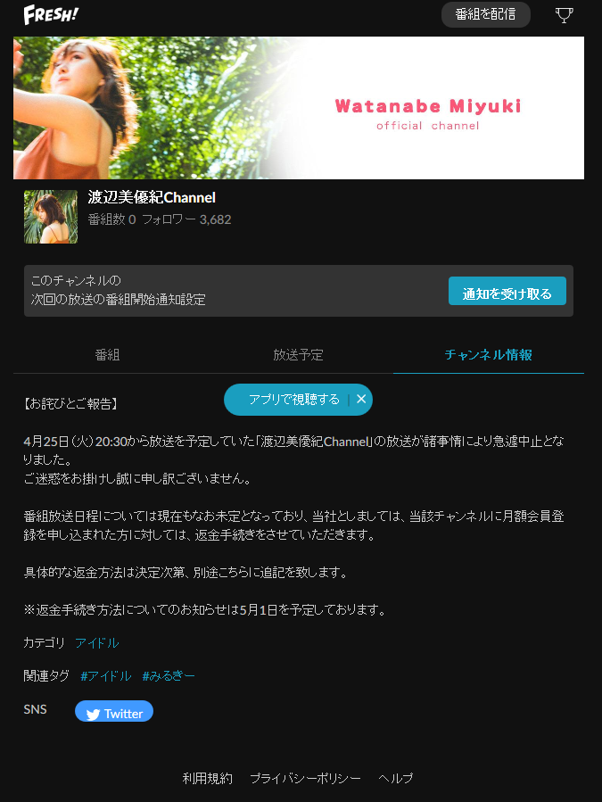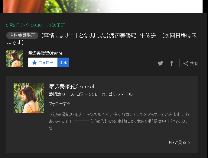 4月25日(火)20:30から放送を予定していた「渡辺美優紀Channel」の放送が諸事情により急遽中止となりました。