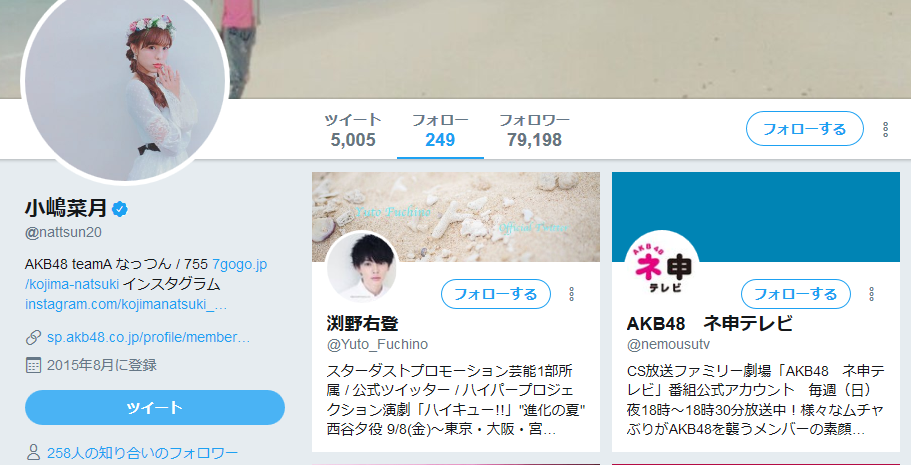 ■渕野右登ツイッターのフォロー欄にAKB48小嶋菜月
