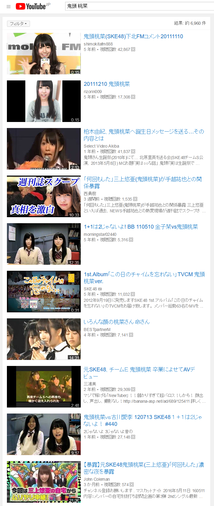 検索して出てくるのはチャンネルだけで動画へのリンクは1件もなし