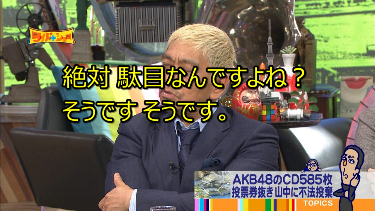 お笑いコンビ「ダウンタウン」の松本人志(54)が22日放送のフジテレビ「ワイドナショー」(日曜前10・00)に出演。「AKB48」のCD585枚が山中に不法投棄された件に触れ、同グループに対し「“不法投棄”という曲を出すべき」と、歌での注意喚起を提案した。(中略)