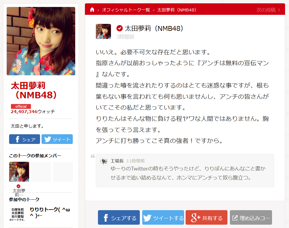 ゆーりのTwitterの時もそうやったけど、りりぽんにあんなこと書かせるまで追い詰めるなんて、ホンマにアンチって奴ら腹立つ。