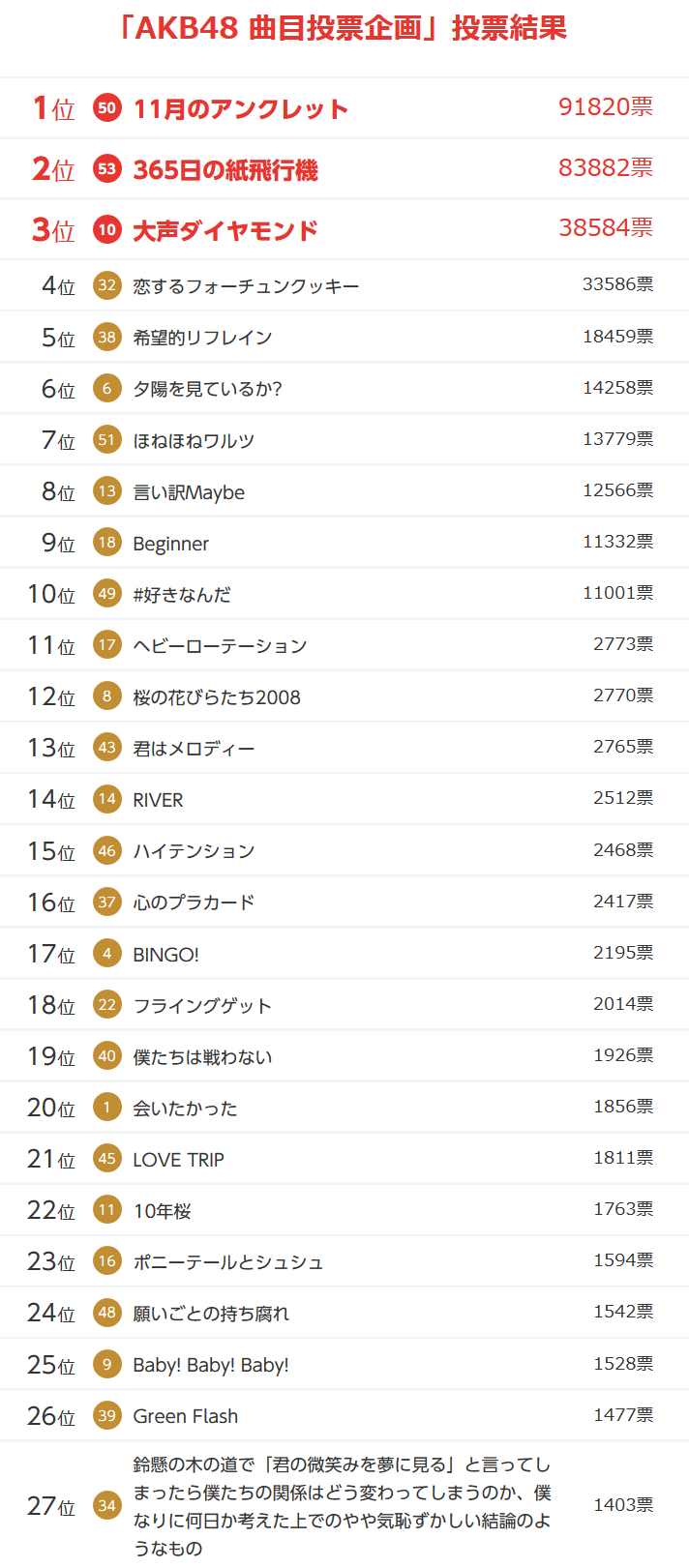 ■【NHK紅白】AKB視聴者投票の上位10曲が決定