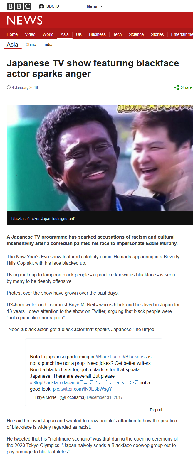 ■BBC News:Japanese TV show featuring blackface actor sparks anger
