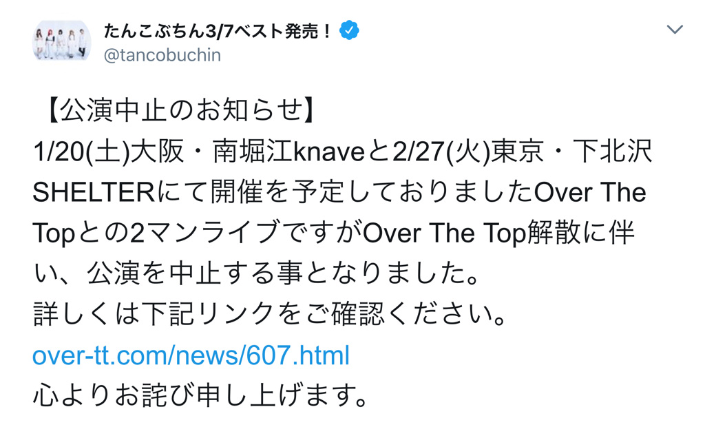 今回の件にあたり、メンバー、スタッフと何度も話し合いを重ねた結果、苦渋の決断ではありましたが「Over The Topは解散する」という結論に至りました。