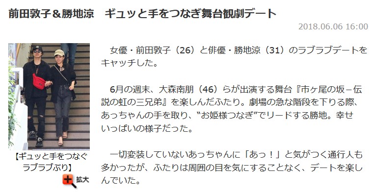 かねて交際していた俳優の勝地涼(31)と元AKB48で女優の前田敦子(27)が結婚したことが31日、分かった。人気俳優とAKBの絶対エースだったあっちゃんの電撃婚はビッグニュースとして列島を駆け巡りそうだ。