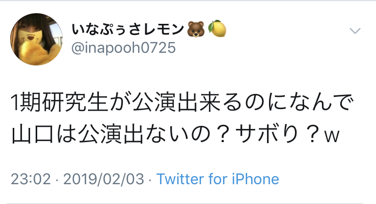 1期研究生が公演出来るのになんで山口は公演出ないの?サボり?w