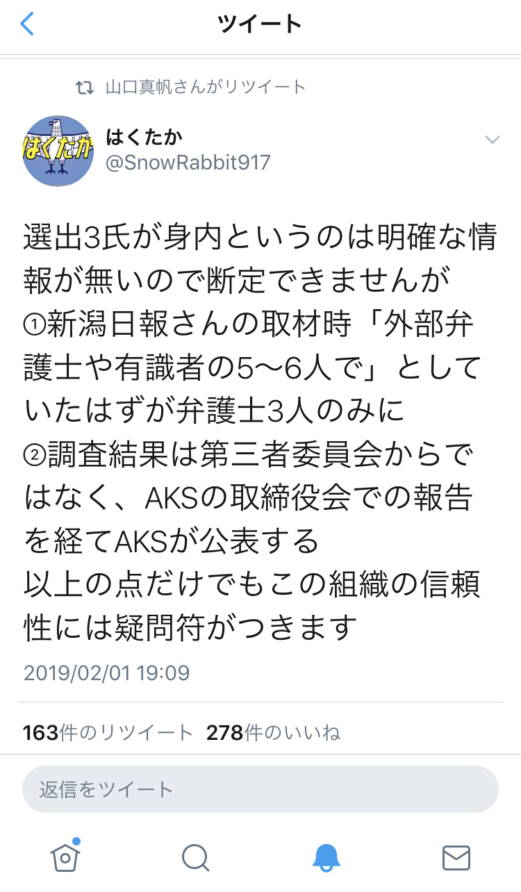 この事件「もう一度、山口真帆さんが謝罪させられて終結」すらあり得ると思っている。第三者委員会がメンバーの共謀はなかったと結論付けて、山口真帆さんが「取り乱して多くの方にご迷惑をおかけして申し訳ありませんでした」と謝罪。そして山口真帆さんは退場。これが運営の望むシナリオじゃないの?