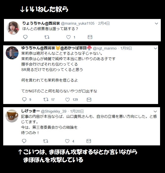 あと、AKSが引き伸ばすのは、NGTメンバーに、「公演がない、仕事がない、それで収入が減った」のは山口真帆氏のせいだと段々と思わせたいという理由もある。他メンバーと山口氏を不仲にさせる作戦。これについては解決するための仕事が遅い運営100%の責任だ。