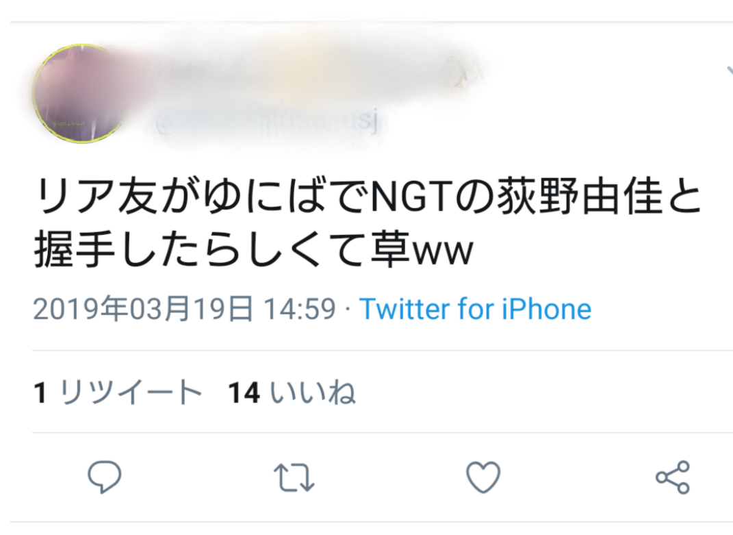 リア友がゆにばでNGTの荻野由佳と握手したらしくて草ww