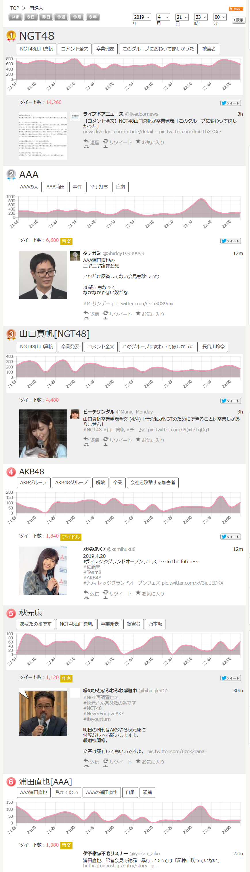 ついっぷるトレンドでは3位に「山口真帆」 【2019/04/21 23:00】